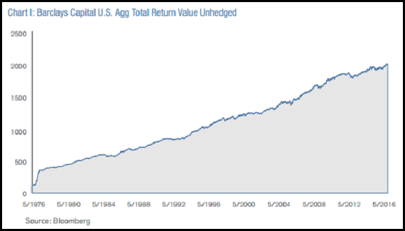 In support of his position, Gross produces two charts, the first one of which shows the total return of the Barclays Capital U.S. Aggregate Bond Index, the benchmark index for the U.S. bond market. The index includes investment-grade bonds across all segments (Treasury, agency, corporate, mortgage-backed, etc.) with at least a year to maturity: