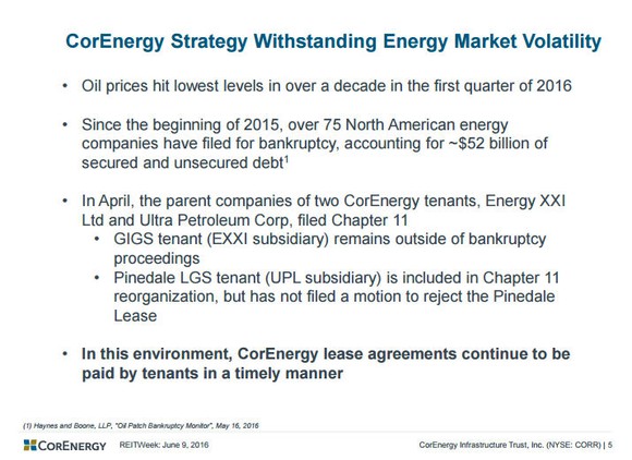 On one hand, CorEnergy owns "property" that is vital to its oil and gas drilling customers. Without the pipelines CorEnergy owns, they can't get their product to market. That puts a special onus on keeping current with rent. On the other hand, two of CorEnergy's largest lessees, representing nearly 60% of 2015 revenues, have fallen into bankruptcy. That basically means they could, potentially, stop paying rent.