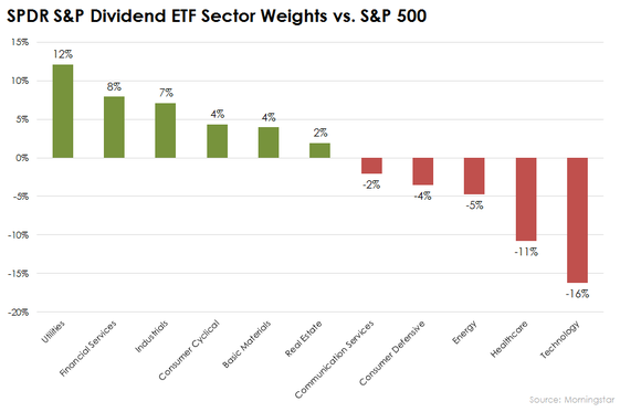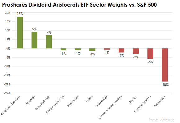Notably, the requirement that a company have an uninterrupted history of paying larger dividends for 25 years means that it is heavily underweight technology stocks (it doesn't own any, per Morningstar data), and heavily invested in consumer defensive stocks (also known as consumer staples).
