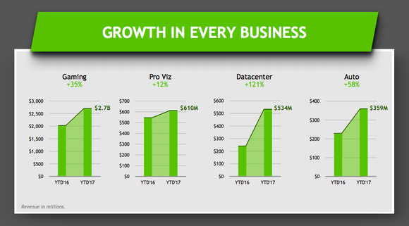 However, thanks to the graphics-intensive nature of technologies like artificial intelligence, self-driving cars, machine learning, and eSports, NVIDIA has seen an absolute explosion in demand for its graphics-processing units, or GPUs. Here's a snapshot of how each of its four-core operating segments performed in NVIDIA's most recently reported quarter.