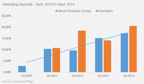 Releasing spreads measure the change in rent per square foot between new and expiring leases. For instance, of the lease agreements that expired between the end of the third quarter of 2013 and the third quarter of 2014, Simon released those spaces at an increase of 17.3% per square foot, while Macerich increased its rent by 20.5% over expiring leases.