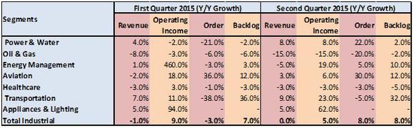 Industrial business segments' revenue contribution. Image source: General Electric Q2 2015 press release. Chart by author.