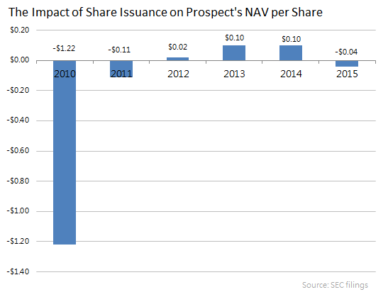 To gain shareholder support, Prospect Capital noted in its proxy filings that during the last three years, its sales of stock have generally been at above-NAV prices. Issuing new stock during that period actually increased its NAV per share by $0.16. This is true.