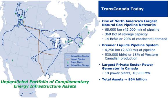 TransCanada earns its money by operating an enormous system of natural gas and oil pipelines and extracting toll-booth like fees under long-term contracts. The predictable cash flow this generates allows it to fund its dividend and help pay for its enormous growth backlog of projects -- $46 billion of projects already secured by long-term commercial contracts with another $50 billion worth management is currently considering.