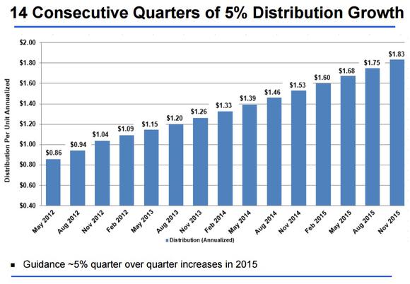 However, thanks to four large long-term contracted, fixed-fee midstream projects coming online in 2015, the MLP was able to deliver year-to-date fee-based adjusted EBITDA growth of around 40%, which is what allowed DCF to increase.