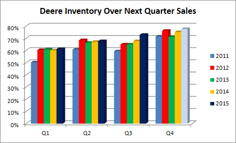 Moreover, on one measure, Deere and AGCO are both seeing somewhat of an inventory build. Here's a look at Deere's inventory-to-next-quarter-sales ratio -- a lower number is better. The figures for Deere in 2015 are getting worse compared to previous years.