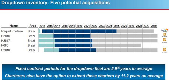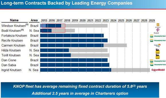 Meanwhile, offshore Brazilian oil projects have a breakeven price of around $40 per barrel. That's low enough for BG Group -- which is being acquired by Royal Dutch Shell (NYSE: RDS-A) -- which has signed long-term contracts for three of KNOT Offshore's five potential drop down candidates.