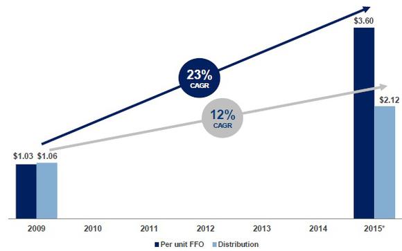 Which is why I love Brookfield Infrastructure's conservative payout principle of growing the distribution slower than funds from operation per share as well as AFFO. This does two things.