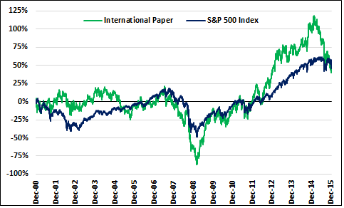 Raw-material pricing was broadly favorable in 2015, but box prices have stagnated over the past few years as world demand struggles to absorb new capacity. So why did International Paper so suddenly lose favor with investors? Last winter's weather was unhelpful, making it difficult for some mills to remain in full production. The collapse of the Russian ruble has severely crimped the contribution from International Paper's Ilim joint venture, which is largely financed in U.S. dollars, and currency effects were felt elsewhere, too. The company has been withdrawing from China, which ought, in current circumstances, to be regarded as a positive, but there may still be sufficient residual enthusiasm for the now-broken China growth story for these moves to be interpreted negatively. International Paper was exploring the possibility that it might place some mills into a master limited partnership structure, which would have had significant tax advantages, but this was nixed by an adverse Internal Revenue Service ruling last May. Investment in new plant proceeds apace, which is unhelpful to all participants in the industry until the new capacity is absorbed.