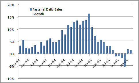 Fastenal always gives great monthly data. Here is a chart of daily sales growth for its stores open more than five years (it's better to use mature stores to analyze sales data).